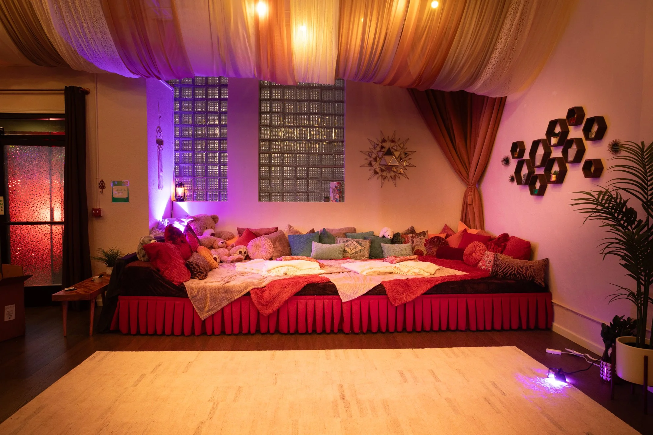 Affectionately known as the “Cuddle Couch” this large daybed area is the heart of HeartLab. It can seat up to 15 people and doubles as a stage for performances or ceremonies. Draped in colorful pillows and soft fabrics, it’s a perfect nook for conversation, connection, or cozy community moments.